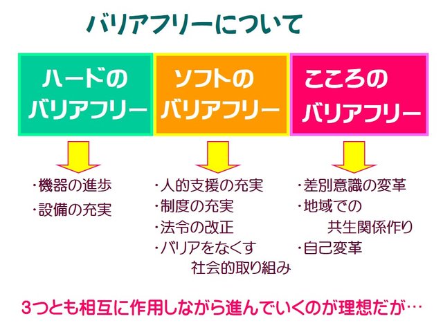 進むことはいいんですが、わたしはそのことによる危惧を2点感じています。一つは、その恩恵を受けることができる人が満足してしまい、バリアフリー改善の志を失ってしまうこと。もう一つは、社会が「これだけ機器・設備面でのバリアフリーが進んだのだから、あとは障害者の能力の問題。能力なき障害者はダメな存在」と見なす風潮が広がることです。それは相対的に、制度面や心の面でのバリアフリーの後退につながります。