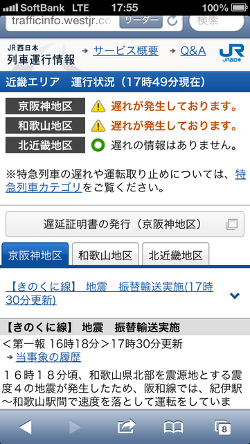 iPhoneのJR西日本運行情報の画面