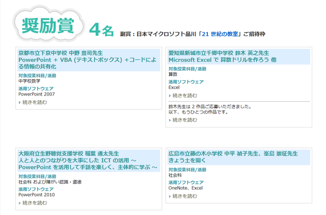 優秀賞2名、奨励賞4名のうち、奨励賞に入れていただきました。涙が出るほどうれしい受賞です。以前、退職された先生から、「教師はやっぱり文部科学大臣賞とか表彰を望む人が多いんだよ」と聞きましたが、わたしにとっては文部科学省よりMicrosoftです。ICTに取り組む者にとってはMicrosoft。日本法人とはいえ、この、知らない人はいない世界最大のコンピューター関連会社から認めてもらうことはやはり心に秘めた夢でした。