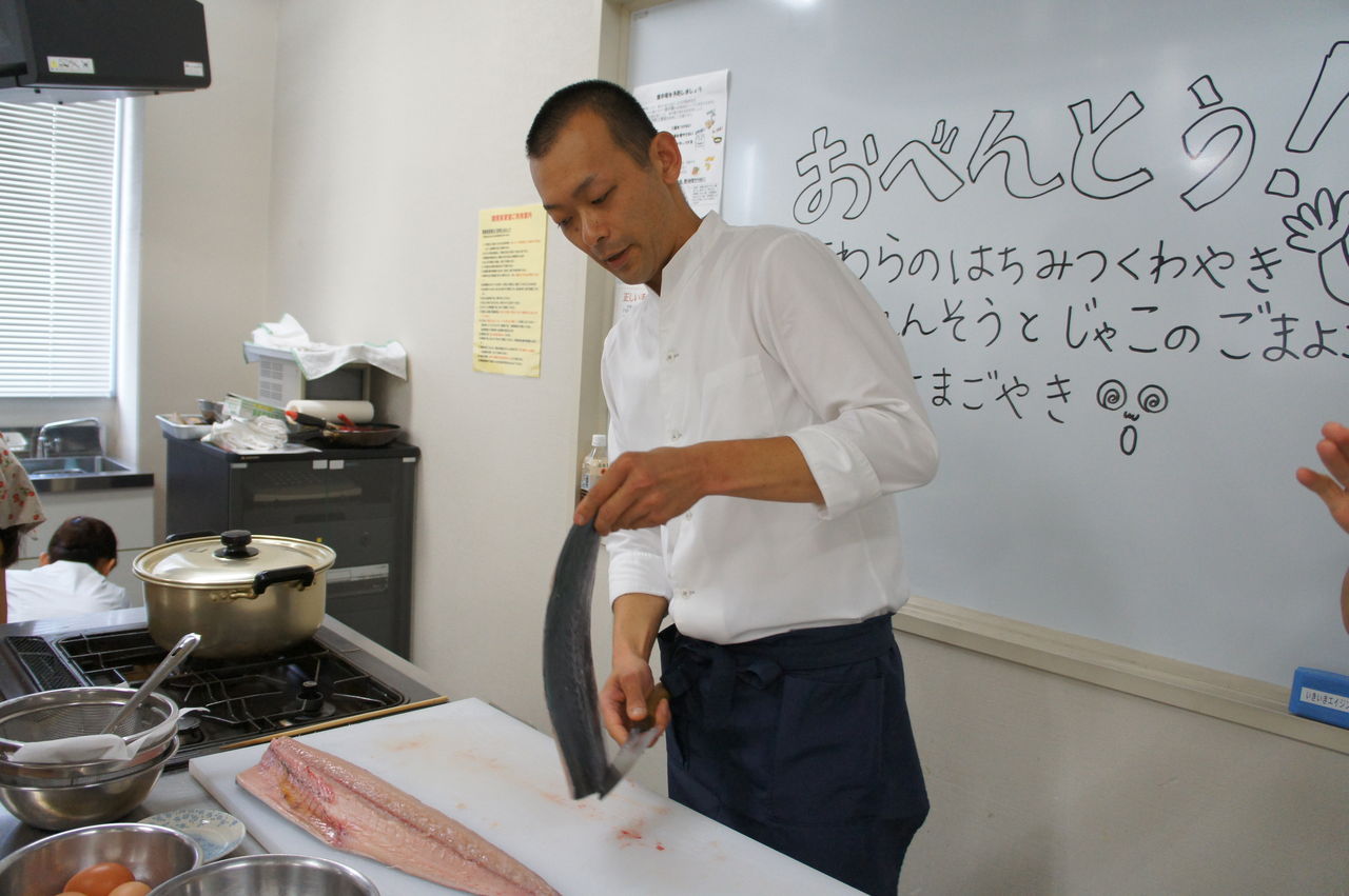 この前の日曜日、わたしの所属するNPO法人デフサポートおおさかとNPO法人essenceのコラボ企画として子どもだけでも参加できる料理教室を開きました。講師は、大阪西区・靱本町の日本料理店「がく」の今川 岳さん。聴こえる子、聴こえない子、そして保護者、いろんな人が集まった楽しい料理教室でした。今川さんの調理を身をのりだして見つめる子どもたち。ちゃちゃを入れる子もいましたがそれもまた良し、です。今川さんの子どもへの返し方、とても良かったです。