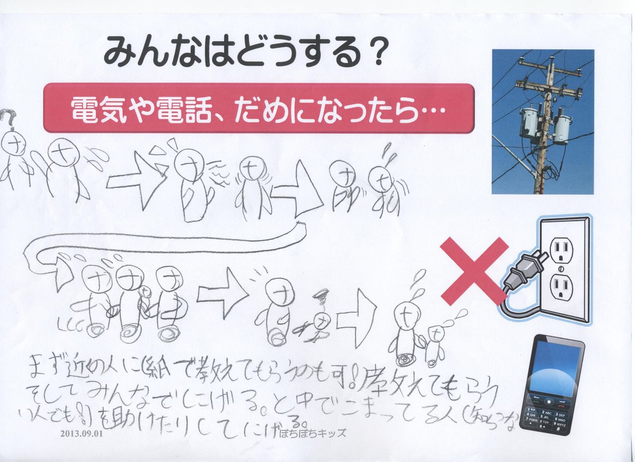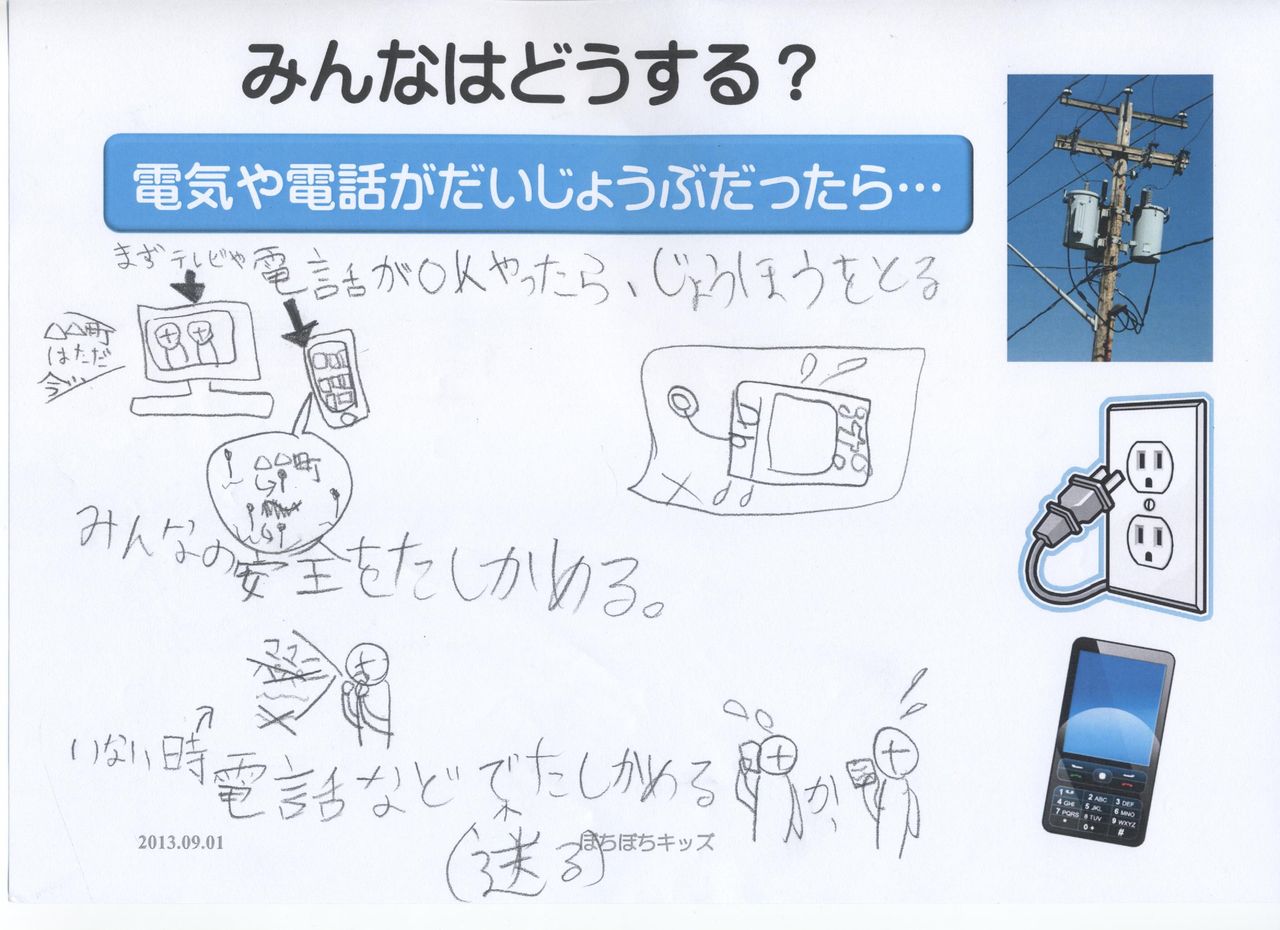 小学生の子どもたちですから、あまり深くしても考えにくいので、聴こえる人がそばにいないと仮定して、電気や電話などが大丈夫な時とそうでない時、2つのケースについて考えさせました。絵で表現してもいいよと自由に書き込ませました。ある子が考えたものをここに紹介します。
