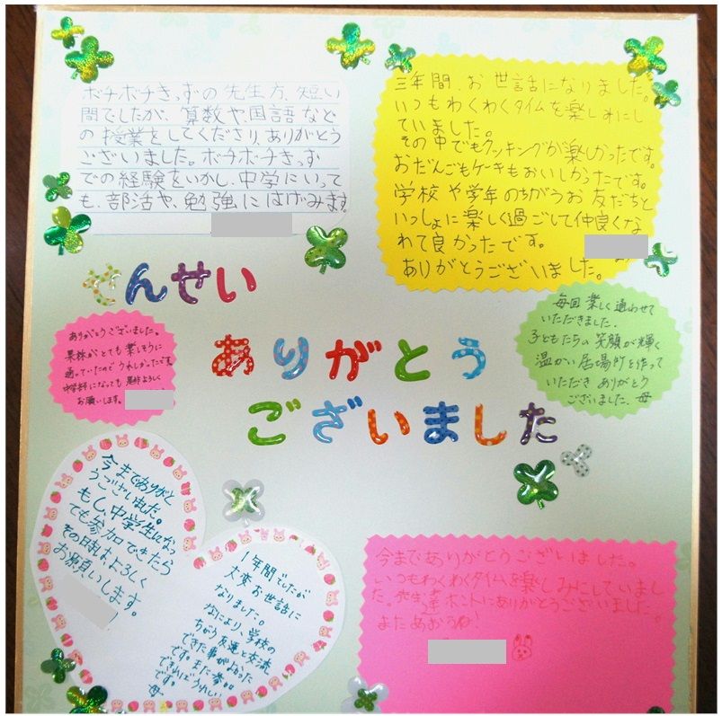 卒業生の子どもたち、保護者の方々から色紙もいただきました。日曜日に学びに来てくれた子どもたち、スタッフの皆さんに感謝!です。