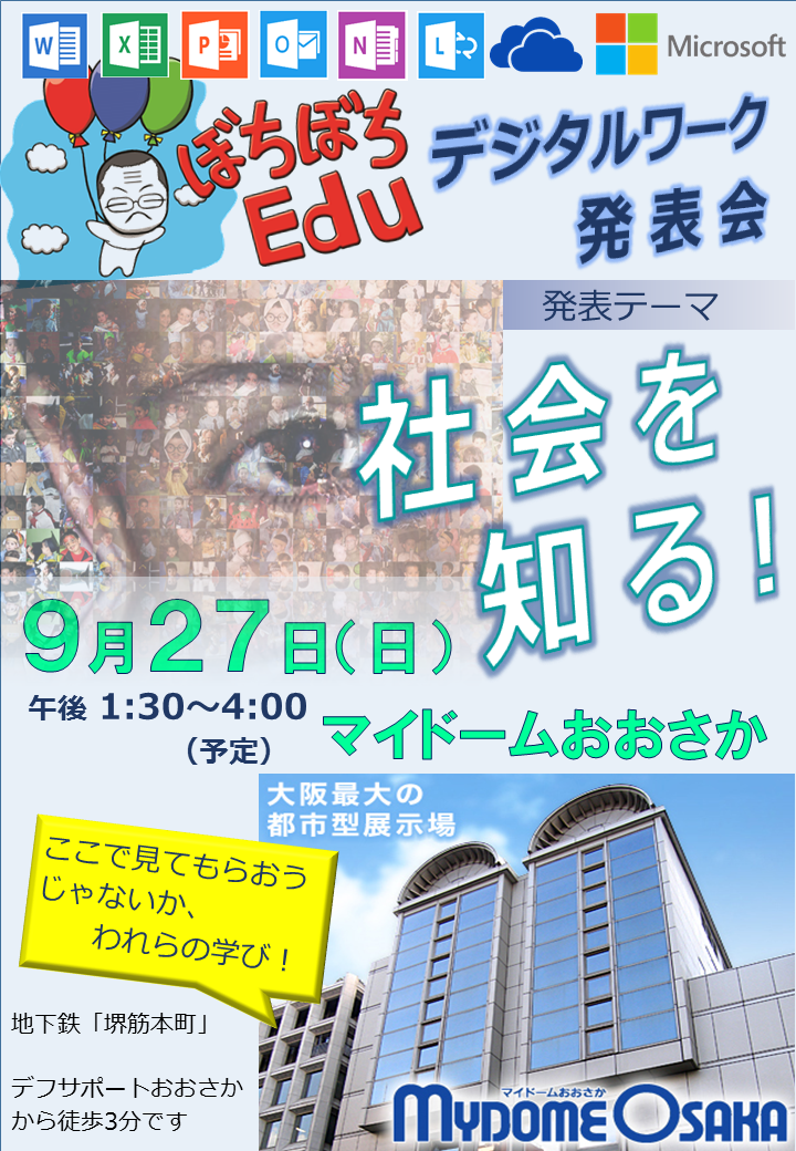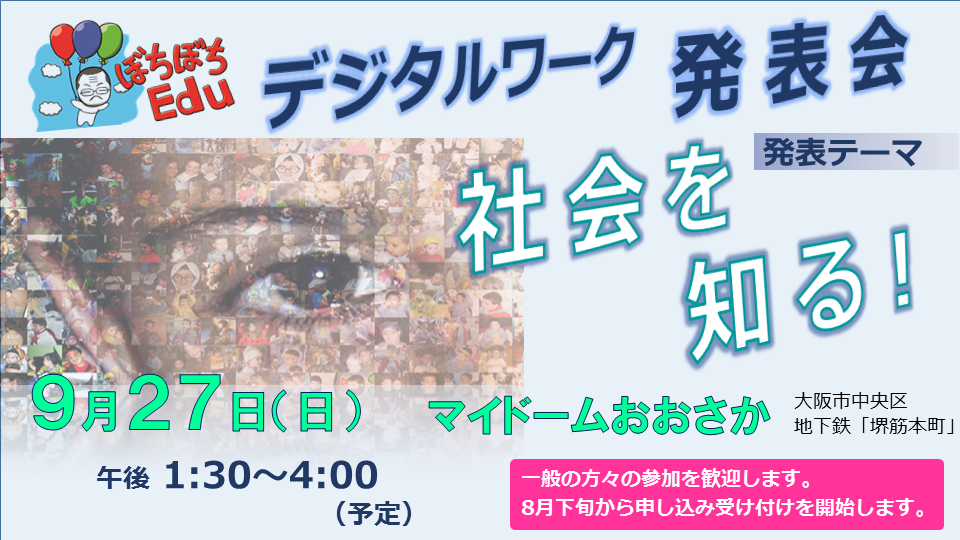 ぼちぼちEdu、9月27日(日)にデジタルワーク発表会をします。テーマは「社会を知る」。ちょっと重いテーマですが、生徒たち、調べ学習を終え、PowerPointを使ってプレゼン作りをやっています。みんな、がんばっています。