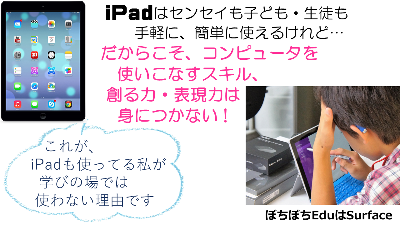 教育現場でもiPadを使う先生って多いですが、しっかりした考えで使ってる人もいますが、じっくり見てるとPCのスキルがないがゆえにiPadを使ってるんじゃないかなあって感じる時もあります。